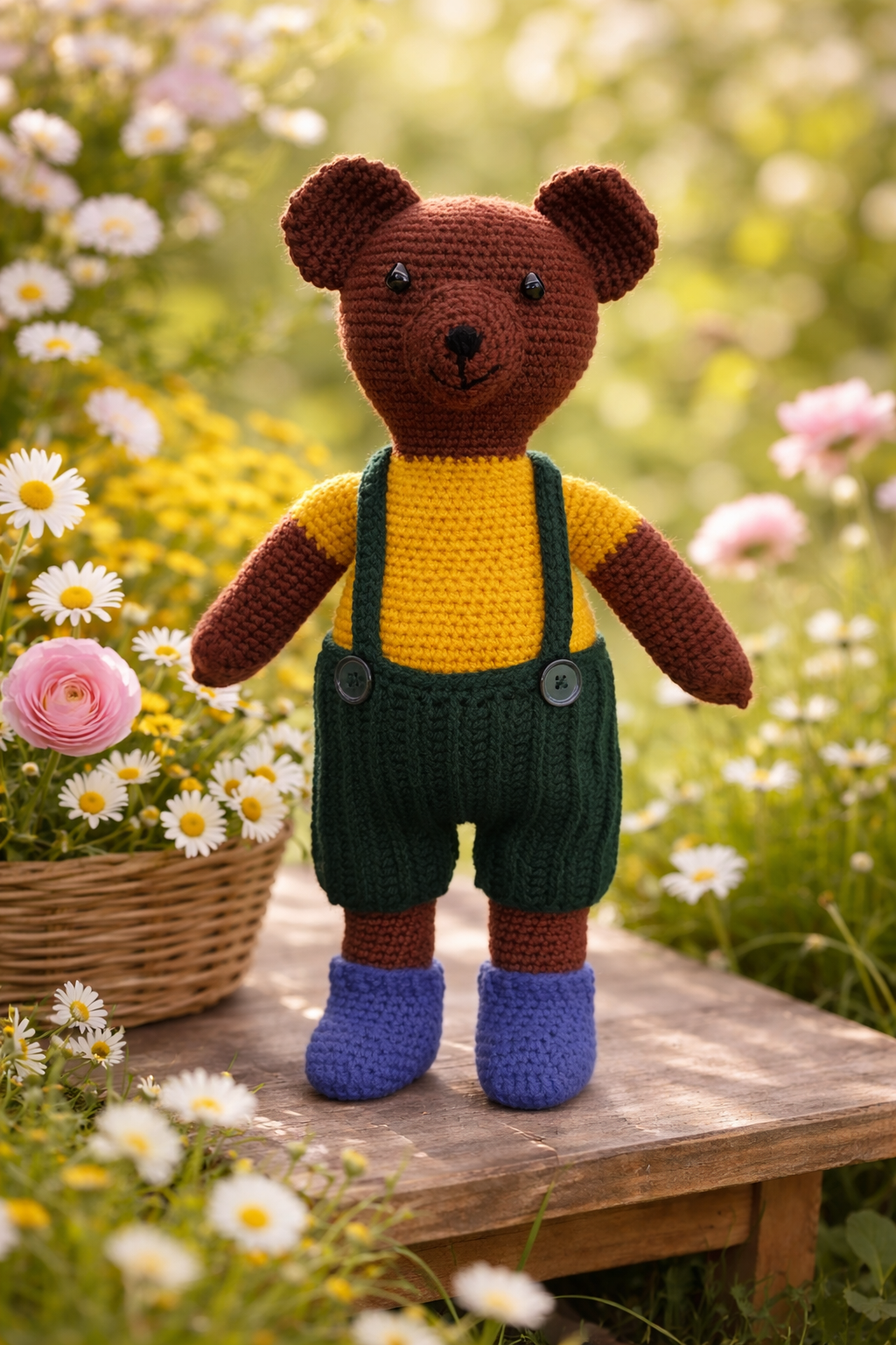 Kuscheliger gehäkelter Bär mit viel Liebe zum Detail.