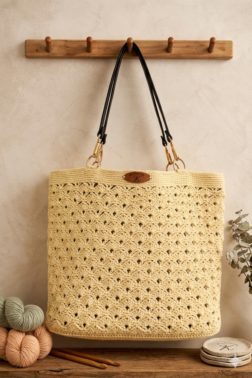 Shopping Bag aus Acryl/Baumwoll Garn mit schwarzen Kunstleder Gurten.