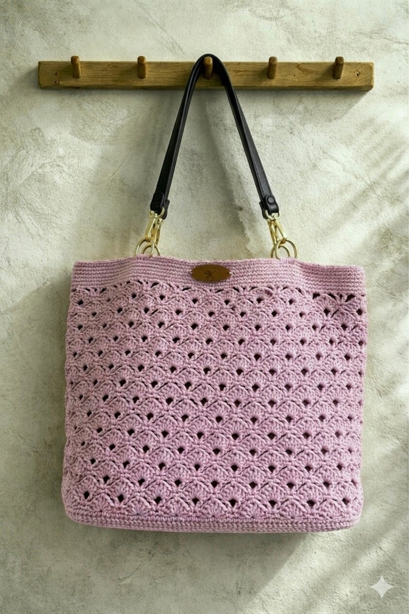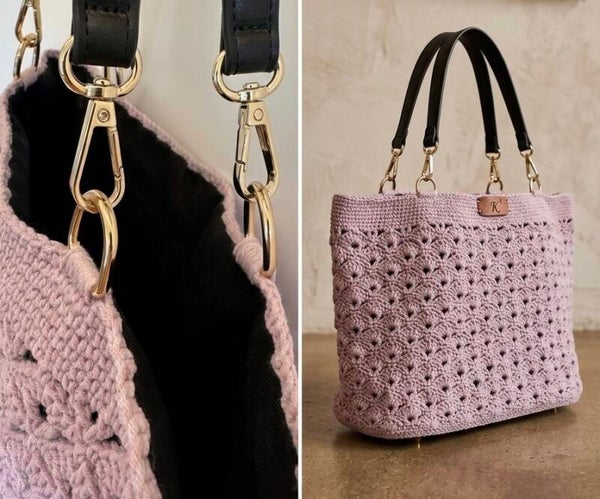 Shopping Bag aus Acryl/Baumwoll Garn mit schwarzen Kunstleder Gurten mit goldenen Karabiner.