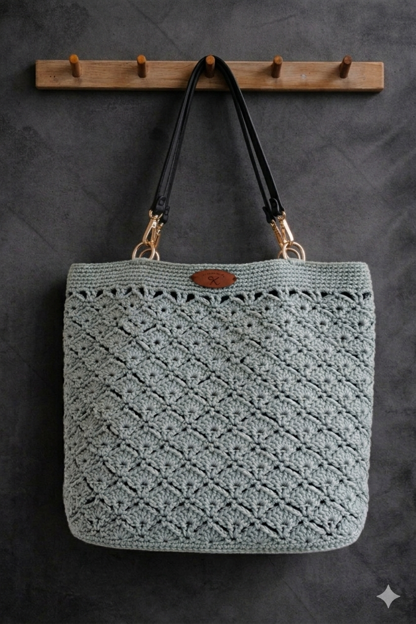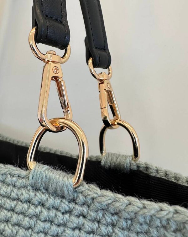 Shopping Bag aus Acryl/Schurwolle Garn mit schwarzen Kunstleder Gurten mit goldenen Karabiner.